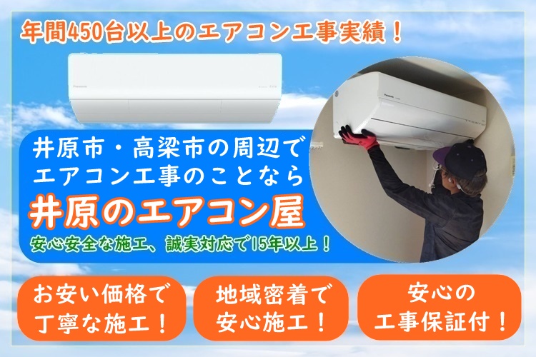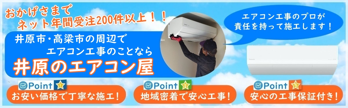 井原のエアコン屋は家庭用のエアコン工事を主にエアコン取り付け・取り外し工事をおこなっている地域密着のエアコン工事業者で、井原市・高梁市を中心に岡山県で活動しております。